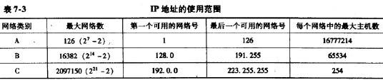 將IP地址劃分為3個類別,當初是這樣考慮的。各種網絡的差異很大,有的網絡擁有很多主機,而有的網絡上的主機則很少。將IP地址劃分為A類、B類和C類可更好地滿足不同用戶的要求。表7-3列出了IP地址的使用范圍。A類IP地址的網絡號數不多,最多只能標識27-2=126個網絡,每個網絡最多可以有1600萬個主機。B類地址可以標識16382個網絡,每個網絡最多可以連接65534個主機。C類地址可以標識2百萬個網絡,每個網絡最多可以接254個主機。現在能夠申請到的IP地址只有B類和C類兩種。當某'個單位申請到一個IP地址時,實際上只是獲得了一個網絡號net-id。具體的各個主機號host-id則由該單位自行分配,只要做到在該單位管轄的范圍內無重復的主機號即可。