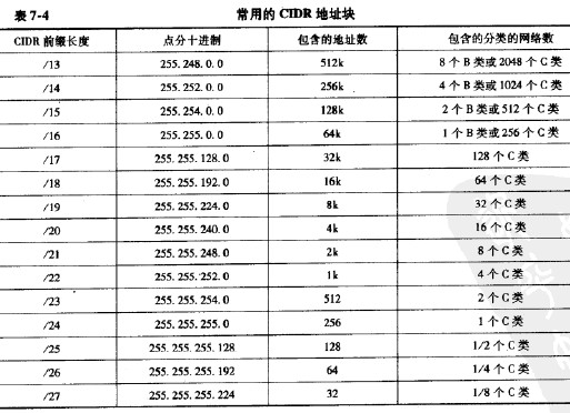 從表7-4可看出,除最后幾行外,C1DR地址塊都包含了多個C類地址。