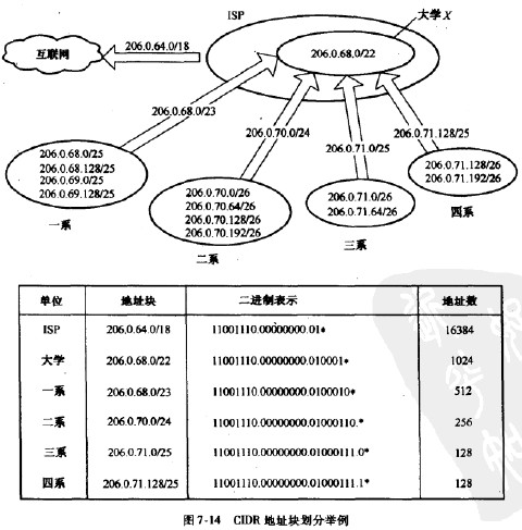從圖7-14下面表格中的二進制地址可看出,將四個系的路由聚合為大學的一個路由, 是將網(wǎng)絡前綴縮短。網(wǎng)絡前綴越短,其地址塊所包含的地址數(shù)就越多。