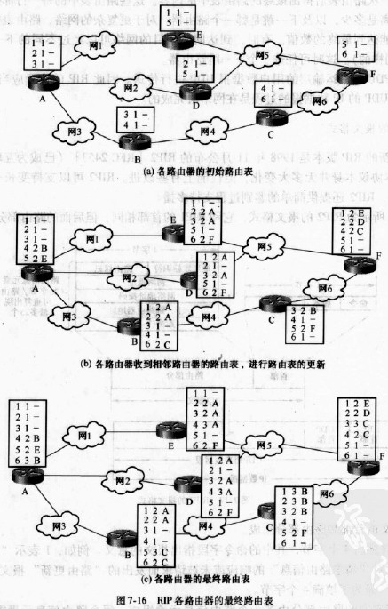 圖7-16所示說明了使用RIP各路由器,其路由表的初始數據和最終數據。