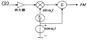 (1)矢量合成法(窄帶調相NBPM):這種方法主要針對的是窄帶的調頻(調頻指數mf≤1)或調相信號(mp≤π/12),此時調相波可由兩個信號合成得到。如圖2-14所示。