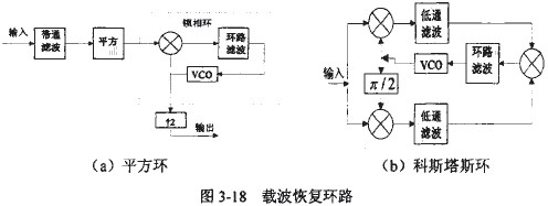 2CPSK信號(hào)的幅度是恒定的,解調(diào)方式必為相干解調(diào)。因?yàn)?CPSK信號(hào)是抑制載波的雙邊帶信號(hào),不存在載波分量,所以必須通過(guò)非線(xiàn)性變換來(lái)產(chǎn)生載頻分量。方法常用兩種:一是圖3-18(a)所示的平方環(huán);另一種是圖3-18(b)所示的科斯塔斯(Costas)環(huán)。