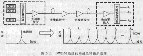 DWDM系統(tǒng)的構成及光譜示意圖如圖2-11所示。發(fā)送端的光發(fā)射機發(fā)出波長不同而精度和穩(wěn)定度滿足一定要求的光信號,經(jīng)過光波長復用器復用在一起送人摻鉺光纖功率放大器,再將放大后的多路光信號送人光纖傳輸.傳輸過程中可以根據(jù)情況選用光線路放大器,到達接收端經(jīng)光前置放大器放大以后,送人光波長分波器分解出原來的各路光信號。我們通常把光信道間隔較大(甚至在光纖不同窗0上>的復用稱為光波分復用(WDM),把在同一窗口中信道間隔較小的波分復用稱為密集波分復用(DWDM)。