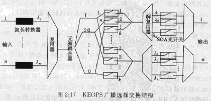 廣播交換選擇結構有兩種:KEOPS廣播選擇交換結構和循環光緩沖廣播選擇開關。不同波長上的輸人光分組復用進交換單元,然后廣播至所有輸出端口,最后,波長選擇器在輸出端口選擇特定波長和光分組輸出。這種交換結構支持IP多播。