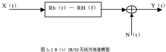 采用直接強度調制的數字無線光接入系統中,如果背景光噪聲較低,信道模型一般抽象為泊松信道,泊松計數速率為(λs(t)+λn),λs(t)是散彈噪聲計數速率,和探測器探測到的瞬時光功率成比例,λn是背景噪聲的計數速率,和背景噪聲成比例。但是當λn足夠大時,且系統采用寬帶探測器時,探測器的散粒噪聲可以認為是加性高斯白噪聲(AWGN)再加上一個直流偏置。圖3.2表示無線光接入系統的信道模型: