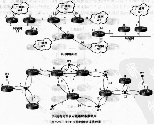 每一種網(wǎng)絡(luò)都可能帶有多個(gè)路由器。圖7-22 (a)是包括這3種網(wǎng)絡(luò)連接的一個(gè)自治系 統(tǒng)的例子。圖中每一條鏈路的旁邊標(biāo)注的2,3, 4,…表示從網(wǎng)絡(luò)到路由器的代價(jià)(或距 離、時(shí)延等)。圖中沒有畫出主機(jī),因?yàn)橹鳈C(jī)一般都不運(yùn)行OSPF協(xié)議。