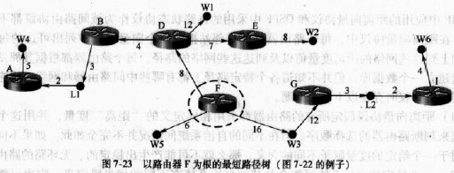 通過各路由器之間交換鏈路狀態(tài)信息,可得出該互聯(lián)網(wǎng)的鏈路狀態(tài)數(shù)據(jù)庫。實(shí)際的數(shù)據(jù)庫是一個(gè)表,但我們可以用圖7-22 (b)所示的有向圖表示該數(shù)據(jù)庫。其中每一個(gè)路由器、局域網(wǎng)或廣域網(wǎng)都抽象為一個(gè)節(jié)點(diǎn),而每條鏈路則用兩條不同方向的邊表示。OSPF規(guī) 定,從網(wǎng)絡(luò)到路由器的代價(jià)為0, +標(biāo)注在圖上。每個(gè)路由器中的路由表可從這個(gè)鏈路狀態(tài) 數(shù)據(jù)庫導(dǎo)出。例如,要計(jì)算路由器F的路由表,可先算出如圖7-23所示的以F為根的最短 00用有向圖表示鏇路狀態(tài)數(shù)據(jù)庫的路徑樹。根據(jù)最短路徑樹就很容易地得出路由器表來。