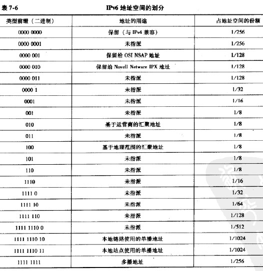 表7-6列出了 IPv6地址空間的劃分。