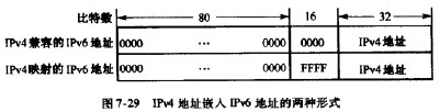 類型前綴為0000 0000的地址空間是保留給與IPv4地址兼容使用的,這是因為必須考慮到在相當長的時間內IPv4與IPv6將會同時存在,而有的節點不支持IPv6。因此IP分組在這兩類節點之間轉發時,就必須進行地址的轉換。圖7-29所示為將IPv4地址嵌人到IPv6地址的兩種形式。若地址的前%bit都是0,而最低的32bit是IPv4地址,則這種地址叫做“IPv4 兼容的IPv6地址”。使用這種地址的節點既支持IPv4,也支持IPv6。若地址的前80bit都是0,接著的16bil全是1,然后是IPv4地址,則這種地址叫做“IPv4映射的IPv6地址”。使用這種地址的節點不支持IPv6。