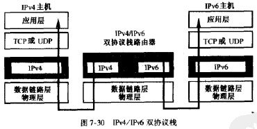 (1)雙協議找。在完全過渡到IPv6之前,使一部分路由器裝有兩個協議棧,一個IPv4 和一個IPv6,如圖7-30所示。這些雙協議棧路由器既能與IPv6系統通信,又能與IPv4系統 通信。它們擁有兩種地址:一個IPv6地址和一個IPv4地址。雙協議棧路由器與IPv6節點 (主機或路由器)通信時采用IPv6地址,與IPv4節點通信時采用IPv4地址。當然,有的主 機也可以裝雙協議找,它們既可接人IPv4網絡,也可接入IPv6網絡。