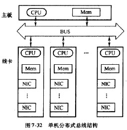 采用準機分布式總線結構的路由器如圖7-32所示。它由主板、多個線卡(Line Card) 及它們之問的共享總線(BUS)組成。這種結構的基本思想是提寐線卡的處理能力,各個線卡相對獨立,并行地完成路由表奄找和分組轉發的操作,而主板主要完成路由計算的功能。