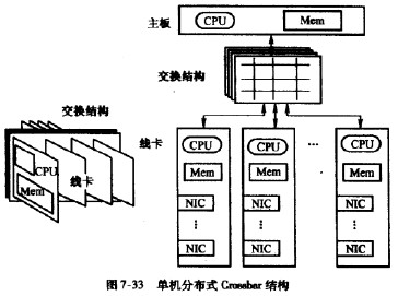 在單機(jī)分布式結(jié)構(gòu)中.使用交叉開關(guān)矩陣(Crossbar)來代替共享總線,就形成了單機(jī) 分布式Crossbar結(jié)構(gòu).如閣7-33所示。共亨總線的弊端就是尤法同時(shí)并行地處埋多個(gè)分組,即使這些分組之間沒有關(guān)聯(lián)也不行。Crossbar結(jié)構(gòu)可以肴做是一個(gè)接點(diǎn)開關(guān)的集合,每對(duì)輸 入端口和輸出端n之間都有一個(gè)接點(diǎn)開關(guān),這些幵關(guān)的控制是彼此獨(dú)立的。這樣,只要各個(gè)分組彼此不相關(guān)(沒有公共的輸入端U和公共的輸出端口),魷可以相應(yīng)地控制接點(diǎn)幵關(guān), 讓這些分紺并行地通過。采用Crossbar進(jìn)行連接進(jìn)一步提商r路由器分布式結(jié)構(gòu)的并行傳輸 能力,從而使得整體的交換容燉得到大幅度的提升。對(duì)于這種結(jié)構(gòu),Crossbar構(gòu)成的交換網(wǎng)絡(luò)(Switching Fabric)可以有不同的拓?fù)浣Y(jié)構(gòu),基本的目標(biāo)是構(gòu)造一個(gè)“無阻寒”的交換網(wǎng)絡(luò)。在這個(gè)領(lǐng)域中,交換網(wǎng)絡(luò)的拓?fù)浣Y(jié)構(gòu),沖突的仲栽機(jī)制以及分組_度算法都是主要的研究內(nèi)容。