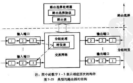 路由器是一種具有多個輸人端口和多個輸出端口的分組交換設(shè)備,其基本任務(wù)是實現(xiàn)IP分組的存儲轉(zhuǎn)發(fā)。這就是說,路由器要從各個輸入端口接收IP分組,分析每個分組的首部,按照分組的目的地址的網(wǎng)絡(luò)前綴(即目的網(wǎng)絡(luò)地址),查找路由表,獲得分組的下一節(jié)點地址,將分組從某個合適的輸出端口轉(zhuǎn)發(fā)給下一跳路由器。下一跳路由器也按照同樣的方法處理分組,直到該分組到達(dá)目的網(wǎng)絡(luò)。圖7-35所示為一種典型的路由器結(jié)構(gòu)框圖。