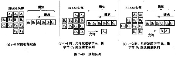 定義7.4預知隊列(lookahead)調度器向隊列發出請求,但與這些請求對應的數據在SRAM中可能未被輸出。這些沒有得到響應的請求組成的隊列稱為預知隊列。圖7-40所示為預知隊列的例子。