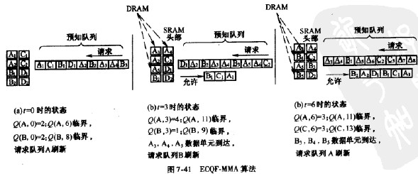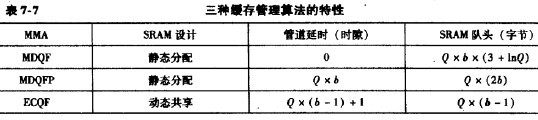 由于有了預知隊列,可以知道W些隊列最需要刷新,因此,在緩存管理上,可以采用共享緩存管理辦法。所以圖7-41所示的SRAM由各個隊列所共享的,預知隊列中嘿個隊列的請求多,在SRAM中存儲的該隊列的數據也就多。這就比靜態緩存管理,即每個隊列在SRAM中隊列長度是固定的更靈活,更能有效地利用緩存。需要說明的是,前面兩種算法要計算每個隊列的虧空值,因此需要依靠靜態緩存管理。ECQF-MMA算法不需要計算虧空值,可以采用共享緩存管理。此時ECQF-MMA需要的所有隊列頭部的緩存容量之和為0x(6-1)。表7-7對三種緩存管理算法的特性進行了總結。