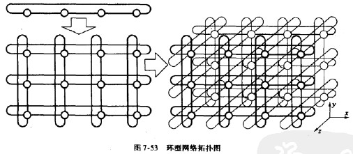 環(huán)型網絡結構如圖7-53所示。圖中分別在不同維度上給出環(huán)型網絡的結構,最后一個是4x3x2的三維環(huán)型結構(3D-TomS)。圖中的小圓圈代表單獨的路由器節(jié)點。從圖中可以看出,每個路由器節(jié)點最多與6個鄰居節(jié)點相連。