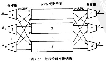 一種典型的PPS結構如圖7-55所示,每個端口的速率為每個輸人端口包含一個分接器(Demultiplexer),每個輸出端口包含一個復接器(Multiplexer),中間部分由一個相同的、速率較低的、獨立并行工作的分組交換模塊(或稱為“交換層面”)組成。每個低速交換模塊被所有的輸人端口共享,各自獨立地處理從輸人端口到達的一部分數據流量。分接器按照一定的規(guī)則選擇輸人分組所要通過的交換層面。因為從線速為《的外部鏈路輸人的分組通過分接器被分配到K條鏈路上,所以分接器每條輸出鏈路的速率至少應該為R/K。分組流通過交換層面后,在輸出端口被復接器重新組合輸出。當發(fā)生擁塞時,分組在各交換層面中排隊,等待復接器的輸出鏈路空閑時再輸出。每個輸人分接器的負載平衡判決都是獨立執(zhí)行的,各個輸人分接器之間無需相互通信,各層之間也沒有共享分復接器為了提高PPS交換網絡的吞吐率和減隊時延,PPS交換網絡內部鏈路必須加速,也就是使r=s(r/k)其中S被稱為內部鏈路的加速比。S的取值范圍為1<s<k通常取S-l~2。