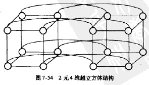 超立方體網絡的典型結構是2元;l(n-3)維立方體網絡,它有n個維度,每一維上均含有2個節(jié)點,每維距離最長的節(jié)點之間不環(huán)接。圖7-54表示的是一個2元4維超立方體網絡的結構圖。