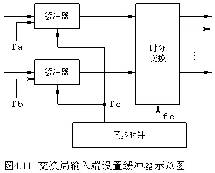 圖4.11是在交換局的輸入端設置緩沖器的示意圖。圖中A局和B局的數字信號到達C局,它們的時鐘信號頻率分別為f a、f b和f c,并且在同一基準頻率上下略有偏差。C局分別按f a、f b寫緩沖器,按f c讀緩沖器,當f a、f b和f c之間誤差積累到一定程度時,在數字信號流中產生滑碼。