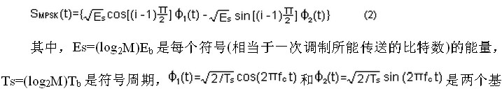 (2)多進制相位(MPSK)調(diào)制 MPSK調(diào)制是多進制相位調(diào)制,載波相位按信息數(shù)據(jù)比特,取M個可能相位值中的一個,即θi=2(i-1)π/M,i=1,2,…M。那MPSK一次調(diào)制可傳送log2M比特的信息數(shù)據(jù),調(diào)制信號為: