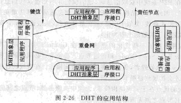 DHT的應用結構如圖2-26所示:應用層將數據對象(文件、數據塊或索引)通過哈希算法獲得鍵值,將該鍵值提交給DHT后,返回結果就是鍵值所在節點的IP地址。