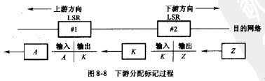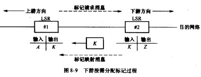 圖"8-10所示給出了上游分配標記的例子。在這個例子中,LSR#1生成標記尺,并將標記放人轉發表中與該路由相關聯的表項的輸出標記字段中,然后通過點對點鏈路向LSR#2發送標記映射消息,消息中包含用來指明路由的IP目的地址前綴和綁定的標記尺,MLSR#2是LSR#1通往由IP目的地址前綴所指定的目的網絡路徑上的下一跳LSR。因此,當LSR#2收到來自LSR#1的標記綁定信息時,自然將標記尺放人轉發表中與該路由相關聯的表項的輸人標記字段中。