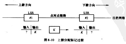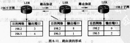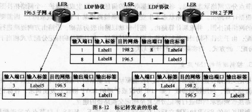 (2)根據(jù)路由表,各路由器在標(biāo)記分配協(xié)議(LDP)控制下建立標(biāo)記轉(zhuǎn)發(fā)表,如圖8-12所示。