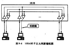 1990年IEEE制訂出10BASE-T星型局域網的標準802.3。這是一種以非屏蔽雙絞線為傳輸媒質、傳輸速率為lOMbitA的星型拓撲的局域網。如圖9-6所示,許多站點通過雙絞線連接到一個中心點,每個站點用兩對雙絞線,一對用于發送,一對用予接收。在中心點設置一個稱為集線器(Hub)的設備。這里,集線器是一個多端口的轉發器,其功能是將任一端口輸人的信號轉發到所有其他端口。集線器采用專用芯片,每個比特信號在轉發之前還要進行整形和再生。