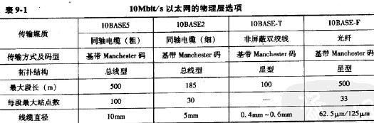 10Mbit/8&太網的物理層有幾種不同的選擇,如表9-1所示。BASE前面的數字“10”表示傳輸速率是10Mbit/S,而后面的數字5或2表示每一段電纜的最大長度為500m或200m(實際上是185m);“T”代表雙絞線,“F”代表光纖。目前使用得最多的傳輸媒質是雙絞線。
