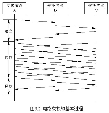 (3) 面向連接。在用戶開始呼叫時,要為兩用戶之間建立起一條端到端的連接,并進行資源的預留(預留時隙)。這樣,在進行用戶信息傳輸時,不需要再進行路由選擇和排隊過程,因此時延非常小。電路交換的基本過程包括呼叫建立、信息傳輸(通話)和連接釋放三個階段,如圖5.2所示。