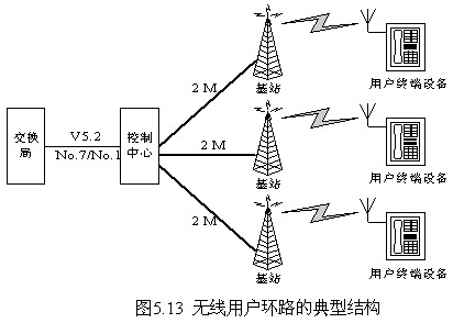 無線用戶環路由三部分組成,即由控制中心、基站和用戶終端設備組成。無線用戶環路一般與電話網相連并作為它的一部分。圖5.13所示為無線用戶環路的典型結構。