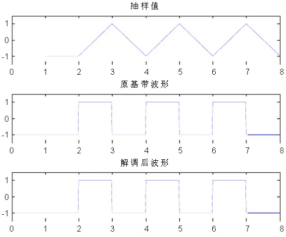 根據(jù)GMSK的調(diào)制原理框圖(圖2-1)以及解調(diào)原理框圖(圖2-4),我們可以利用MATLAB進(jìn)行仿真 ,仿真結(jié)果如下(仿真代碼見附錄)