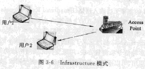 在Infrastructure模式下,所有用戶通過AP中轉(zhuǎn)連接,AP本身具有路由功能,可將AP的lOBase-T接口與網(wǎng)線直接連接,在該AP傳輸距離內(nèi)的所有用戶即可接人互聯(lián)網(wǎng),如圖3-8所不。