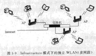 此外,當(dāng)網(wǎng)絡(luò)規(guī)模較大時(shí),可將相鄰的多個(gè)AP與交換機(jī)相連,從而把多個(gè)分散的無線網(wǎng)段連接成為一個(gè)整體,用戶可在其覆蓋范圍之內(nèi)實(shí)現(xiàn)移動(dòng)漫游,如圖3-9所示。