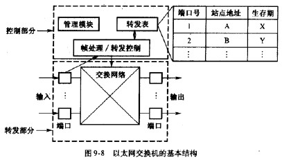 以太網(wǎng)交換的基本功能是實(shí)現(xiàn)MAC幀的轉(zhuǎn)發(fā),所以又稱為第二層交換。與其他交換機(jī)相似,以太網(wǎng)交換機(jī)也是由輸人輸出接口(這里稱為端口)、內(nèi)部交換網(wǎng)絡(luò)和交換控制器等組成。圖9-8示出以太網(wǎng)交換機(jī)的基本結(jié)構(gòu),各端口及連接它們的內(nèi)部交換網(wǎng)絡(luò)構(gòu)成了轉(zhuǎn)發(fā)部分,而交換控制器的主要任務(wù)是實(shí)現(xiàn)轉(zhuǎn)發(fā)控制。