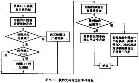 對于存儲轉發式的以太網交換機,緩存器的設置與交換網絡的結構應結合考慮。在存儲器價格低廉的今天,選擇如圖9-9所示的交叉點緩存的Crossbar交換結構是最合理的。從緩存器設置的角度看,它等效于N重輸入緩存方式(參看第6章圖6-22),吞吐率可達100%;從交換結構的角度看,它是空分開關矩陣,可以在多對輸人端口和輸出端口之間并行地工作,從而有利于提高交換的總速率。此外,這種結構也比較適合以太網交換中轉發數據單元(MAC幀)長度不固定的情況。以太網交換的存儲轉發方式與分組交換的原理是類似的,所不同的只是存儲轉發的數據單元,前者是MAC幀,而后者是分組。以太網MAC幘的存儲轉發流程如下: