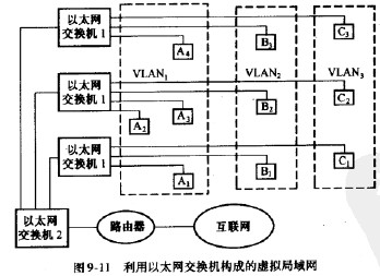 圖9-11中使用四個以太網(wǎng)交換機構(gòu)成了由三個物理子網(wǎng)組成的交換式局域網(wǎng),它被劃分為三個VLAN,即VLAN1:(A1,A2,A3,A4),VLANI2(B1,B2,B3),VLAN3:(C1,C2,C3)。VLAN技術(shù)給LAN的管理、安全及廣播數(shù)據(jù)的抑制帶來如下諸多好處。