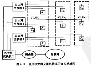 將圖9-11中的上級以太網(wǎng)交換機換成第三層交換機,也是一種解決方案D第三層交換機把第二層的交換功能和第三層的路由功能結(jié)合在一起,為每個VLAN設(shè)置1P網(wǎng)絡(luò)地址和子網(wǎng)掩碼。當(dāng)來自下級以太網(wǎng)交換機的轉(zhuǎn)發(fā)幀到達后,取出幀內(nèi)的IP分組,根據(jù)分組的目的地址,獲得目的站點的VLAN標(biāo)簽,把目的站點的MAC地址作為轉(zhuǎn)發(fā)幀的目的地址,把目的站點的VLAN標(biāo)簽作為幀的VLAN標(biāo)簽,再把偵送給下級交換機。