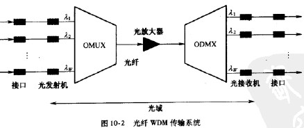 光纖波分復用傳輸系統的基本組成如圖10-2所示。在發送端,各路電信號經過接口電路調制到工作于不同載波頻率的光發射機上,光復用器(OMLX)組合各發射機輸出的光信號,并稱合到同一光纖上傳輸。在接收端,光解復用器(ODMX)分離不同波長的光信號, 分別送給光接收機,并將光信號轉換為電信號,作進一步的處理后從不同的接n輸出。復合光信號在光纖線路上傳輸一段距離后,要用光放大器(OA)對光信號進行中繼放大。這種 光放大器要在整個WDM波段范圍內有平坦的增益,目前普遍采用摻鉺光纖放大器 (EDFA)圖10-2中只表示出一個方向的傳輸,相反方向的傳輸與此類似,不再贅述。
