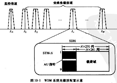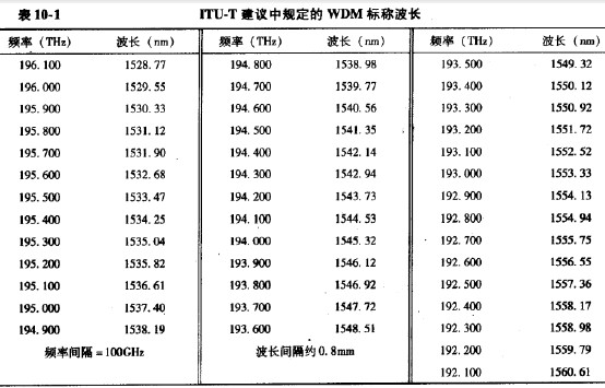 光波分復用(WDM)是在一條光波信道中用多個載波同時傳輸光信號的技術,這些光載波具有不同的中心頻率,按規定的頻率間隔配置。這里所說的光波信道,包括光纖信道和無線光信道。光纖波分復用傳輸系統的工作波段,目前位于1.50Vm-l.60Vn的范圍內。 典型的載波頻率間隔是200GHZ/100GHZ/50GHZ,相應的波長間隔約為1. 6nm/0. 8nm/0.4mn。在所有的光載波中,一般用一個波長作為監控之用,稱為監控波長;其余的載波用 于承載業務信息。圖10-1所示給出光載波配置的示意圖,并表示出業務承載信道傳輸SDH的STM-yv幀的情形。表10-1所示為rru-T建議中規定的標稱光載波頻率和相應的波長。