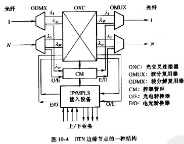 為了提供承載業務,OTN需要給各種用戶業務分配適當的帶寬資源。由上述可見,OTN分配帶寬的最小粒度是一個波長的容量,當前是10Gbit/s,將來可能是4bGbit/s。這么大的容量如經濟地分配給用戶使用,是迫切需要解決的問題這一問題稱為“業務量疏導”問題。從圖10-3看,業務量疏導的任務只能由OTN邊緣節點及與其相接的單波長網絡的節點去完成。這些單波長網絡盡管也可能采用光纖傳輸,但交換肯定是在電域上實現的,如SDH的數字交換設備或IP/MPLS的路由器都是電域的交換設備。通過它們就可以實現帶寬的進一步分配。例如,通過SDH的交換設備,可實現最小粒度為2Mbit/s的帶寬分配;而利用MPM或IP的路由器則能實現連續可變速率的帶寬分配,其粒度可以無限小。圖10-3所示OTN的EN與SDH或IP網絡的節點在地理位置上是分離的,它們之間需要設置光纖鏈路。實際上,一個更好的辦法是在OTN的EN中集成一個SDH或IP/MPLS的接入設備,利用一個或多個波長的容量支持多種業務的接人。這樣,EN就變為一種光電混合的交換節點,而相應的OTN就解決了上述的業務量疏導問題。如圖10-4所示,EN中包含光交叉連接設備OXC和電的IP/MPLS接人設備,通過控制管理模塊CM實現光路的配置和帶寬分配,部分波長的容量用于接納不同帶寬需求的多種業務。