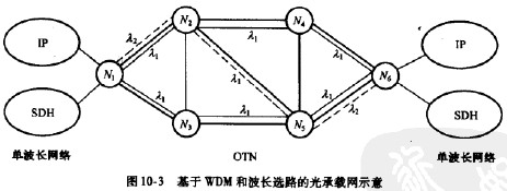 基于WDM的光纖傳輸鏈路與光交換節點可以構成如圖10-3所示的光承栽網(OTN)。在OTN中的節點有兩種類型,它們是:核心節點CN和邊緣節點EN。圖中的況N2,N3,N4屬于QN,它們的基本功能是在光域上實現中繼轉發;圖中的乂厲于EN,它們除了實現中繼轉發以外,還要與外部的單波長網絡(SDH,IP等)接口,對外提供承載業務。當然,某些節點可能兼有CN與EN的功能。在實際的網絡中,相鄰節點之間的光纖鏈路(圖中粗實線)一般是光纜,其中含多條光纖,稱為多纖鏈路;如果只有一對光纖,每方向一條光纖,則稱為單纖鏈路。不失一般性,下面只考慮單纖鏈路,而每條光纖包含多個傳輸波長。在光纖鏈路中由不同波長的載波提供的信道,稱為“波長鏈路”。這樣,一條光纖鏈路包含多條波長鏈路。
