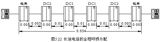 (1) 數字長途電話網的全程呼損應≤0.054,如圖5.22所示。