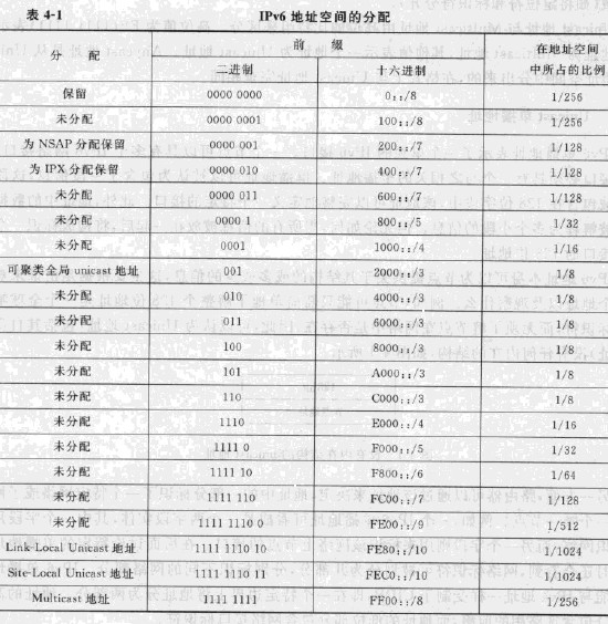 一個IPv6地址的具體類型是由該地址的前幾位數字來指定的,而決定地址類型的這幾位 變長字段被稱為格式前綴FP(F0rmat Prefix,簡稱FP)。這些前綴初始分配如表4-1所示。