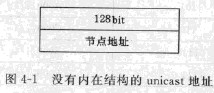 IPv6地址本身可以為節(jié)點(diǎn)提供關(guān)于其結(jié)構(gòu)的或多或少的信息,這主要根據(jù)是由誰來觀察這個(gè)地址以及觀察什么。例如,節(jié)點(diǎn)可能只需簡(jiǎn)單地了解整個(gè)128位地址是一個(gè)全球標(biāo)識(shí)符,而無須了解節(jié)點(diǎn)在網(wǎng)絡(luò)中是否存在,因此,可以認(rèn)為Unicast地址(包括其自身的地址)沒有任何內(nèi)在的結(jié)構(gòu),如圖4-1所示。