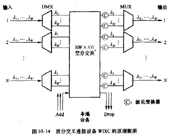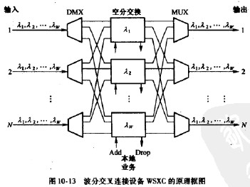如10.2節所述,目前得到廣泛應用的是基于波分復用與波長選路的光承載網絡(OTN)。為了提供承載業務,OTN需要給各種用戶業務分配適當的帶寬資源,而帶寬分配的最小粒度是一個波長信道的容量。因此,作為OTN節點設備的OXC不僅要實現輸入光纖鏈路與輸出光纖鏈路之間的(空分)交叉連接或交換,而且要實現輸人波長鏈路與輸出波長鏈路之間的(波分)交叉連接或交換。波分交叉連接又分為波長選擇交叉連接(WSXC)和波長變換交叉連接(WIXC)。圖10-13和圖10-14分別示出了這兩種交叉連接設備的原理框圖。