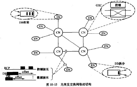 鑒于光路交換和光分組交換存在的上述問題,1999年喬春明博士和華盛頓大學的JonathanS.Turner提出了光突發交換的思想[31]。光突發交換(OpticalBuret Switching,OBS)是一種介于光路交換和光分組交換之間的交換方式。采用光突發交換的光網絡稱為光突發交換網絡(Optical Buret Swilching Netwoik,OBSN),主要用作光互聯網的骨干網絡。0BSN由若干邊緣節點(EN)和核心節點(CN)通過WDM光纖鏈路連接而成,如圖10-15所示。邊緣節點的主要功能是實現業務的匯聚/解匯聚,而核心節點的主要任務是實現數據以突發為單位的轉發。節點之間的光纖鏈路包含多個波長信道,其中部分波長(一般是一個波長)用于傳輸控制信息,稱為控制波長;其余波長用于傳輸用戶業務信息,稱為數據波長。