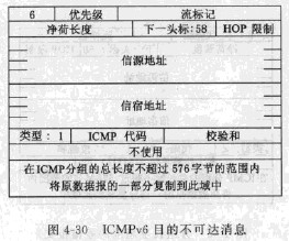 摘要:通信工程師互聯(lián)網(wǎng)技術(shù)考試目的不可達(dá):目的不可達(dá)消息如圖4-30所示,它是在由于目的不可達(dá),網(wǎng)絡(luò)必須丟棄一個(gè)IPv6報(bào)文時(shí)產(chǎn)生的。目的不可達(dá)消息的類型字段值為1,表示這是個(gè)錯(cuò)誤消息,代碼字段取值范圍為0-4。