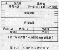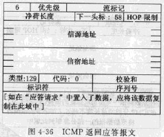 回應請求的格式如圖4-35所示。在該報文中會有標識符、序號和選項等附加數據(extradata)。ICMP雖未對這些域的用法進行標準的定義,但系統應使答復與請求匹配。類型字段值為128,代碼字段值為0。校驗和字段之后是兩個16位的標識符字段和序列號宇段,這兩個字段用來在回應請求消息和應答答復消息之間建立聯系。數據字段為0或由發送主機設置的可選數據。