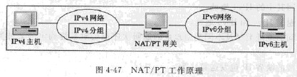 隧道技術一般用于IPv6節(jié)點間的通信,而對于IPv4和IPv6節(jié)點間的通信,采用直接對IPv4和IPv6報文進行語法和語義翻譯的網(wǎng)絡地址轉換/協(xié)議轉換(NAT/PT)技術。基本工作原理如圖4-47所示,當IPv6子網(wǎng)中有IPv6分組發(fā)給網(wǎng)關時,網(wǎng)關將其轉化成IPv4分組發(fā)向IPv4子網(wǎng):反過來當IPv4子網(wǎng)中有數(shù)據(jù)分組要發(fā)送時,網(wǎng)關就將其轉化成IPv6分組發(fā)向IPv6子網(wǎng)。轉化網(wǎng)關要維護一個IPv4和IPv6地址的映像表。